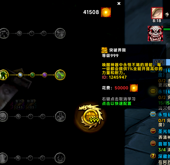无他,唯爆肝熟尔,在周四暴雪热修的时候,暴雪已经将所有玩家的的永恒能量重置在1000万,神器200级,在此之前这帮人的神器等级已经接近650级。重置后他们开启高强度刷级模式,基本上都是每天仅休息2-4小时、轮流吃饭、一人在副本内暂离其余人继续刷、一人单刷副本,其余人暂时休息等爆肝模式,硬生生打了 278次魔法回廊,最终在10.17下午三点半,将神器升到了999级。