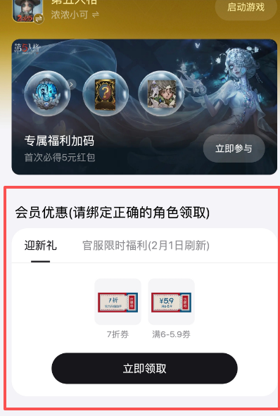 点击第五人格后,会看到会员优惠,但是千万不要直接点领取!!!这是因为7折券只有1个月的时长,如果大家现在领了就不能在下个月重置返利时使用了!